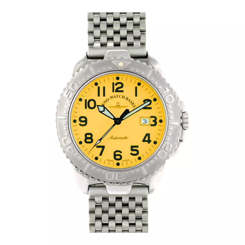 Mechanische, Schweizer Sportuhr mit auffällig, orangem Zifferblatt und super massivem Edelstahl Gliederarmband. Spezialität von ZENO-WATCH BASEL. Der unabhängigen Schweizer Uhrenfabrikation seit 1922. Kleinauflage nur solange Vorrat!