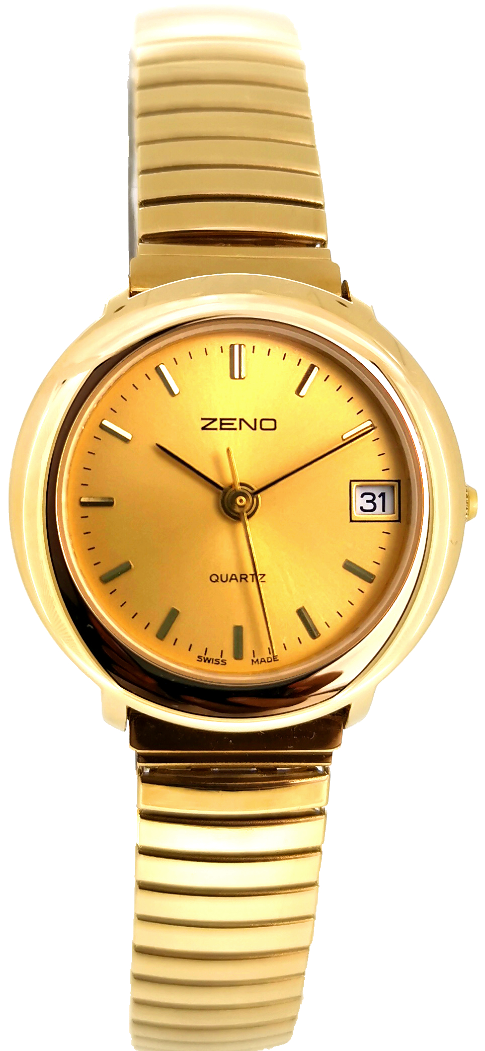 Schweizer Präzisions Quartzwerk, champagne Zifferblatt mit vergoldeten Indexmarkern, schwarz-goldene Stabzeiger, ausgewuchteter Sekundenzeiger, weisse Datumsanzeige (3h)