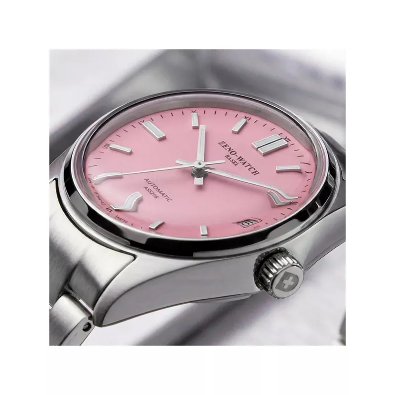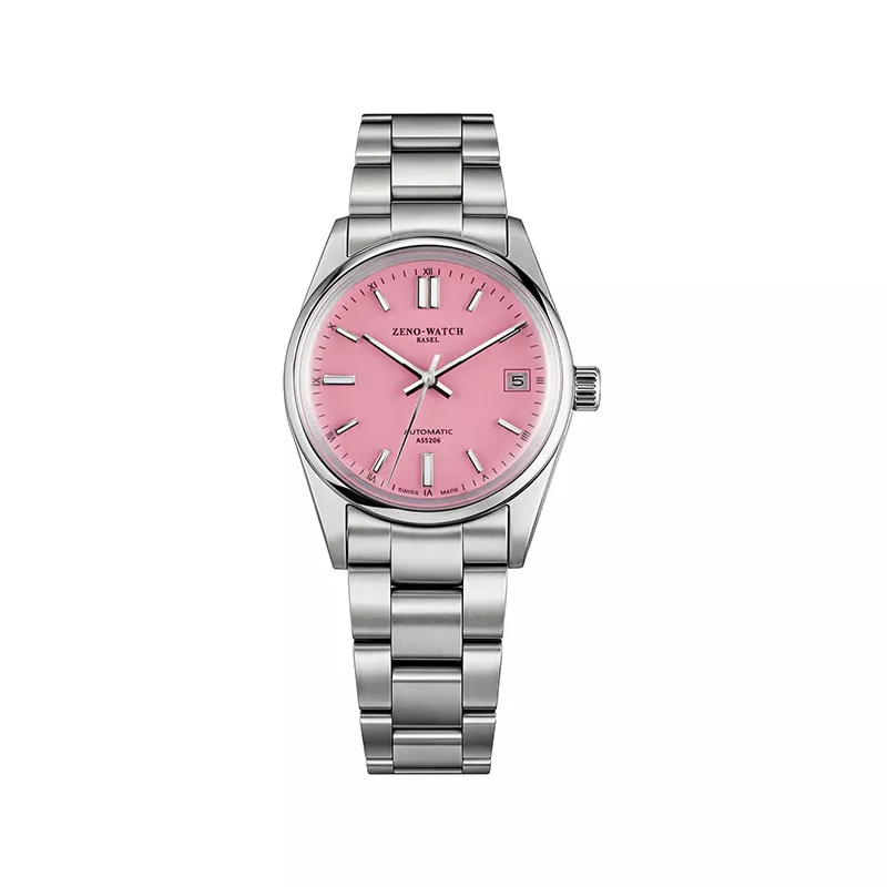 Ø: 35mm - Modische, mittelgrosse Automatik Armbanduhr nach historischem Vorbild aus den 1950er Jahren mit altem mechanischem Uhrwerk. Einzeln nummerierte Auflage von 300 Stück. Eine Spezialität von ZENO-WATCH BASEL, der unabhängigen Schweizer Uhrenfabrikation seit 1922.