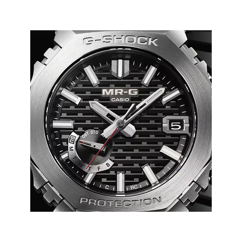 Das Zifferblatt ist inspiriert von Kigumi, der traditionellen japanischen Kunst der ineinandergreifenden Holzverarbeitung, die wie die Lünette der MRG-B2100 unzählige kleine Elemente enthält. Diese traditionelle Kunst spiegelt sich in der aufwändig zusammengesetzten zweiteiligen Struktur der Indexmarkierungen sowie der Tiefe und Dimension des Gittermusters auf dem Zifferblatt wider. Die winzigen Öffnungen des Zifferblatts – ein Kunsthandwerk, das höchste Präzision bei der Verarbeitung erfordert – lassen genügend Licht für die Erzeugung von Solarenergie durch, damit du die Zeit immer im Blick hast.