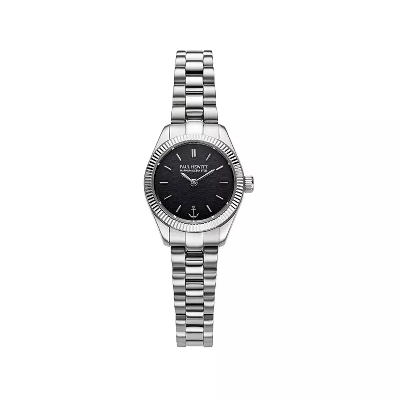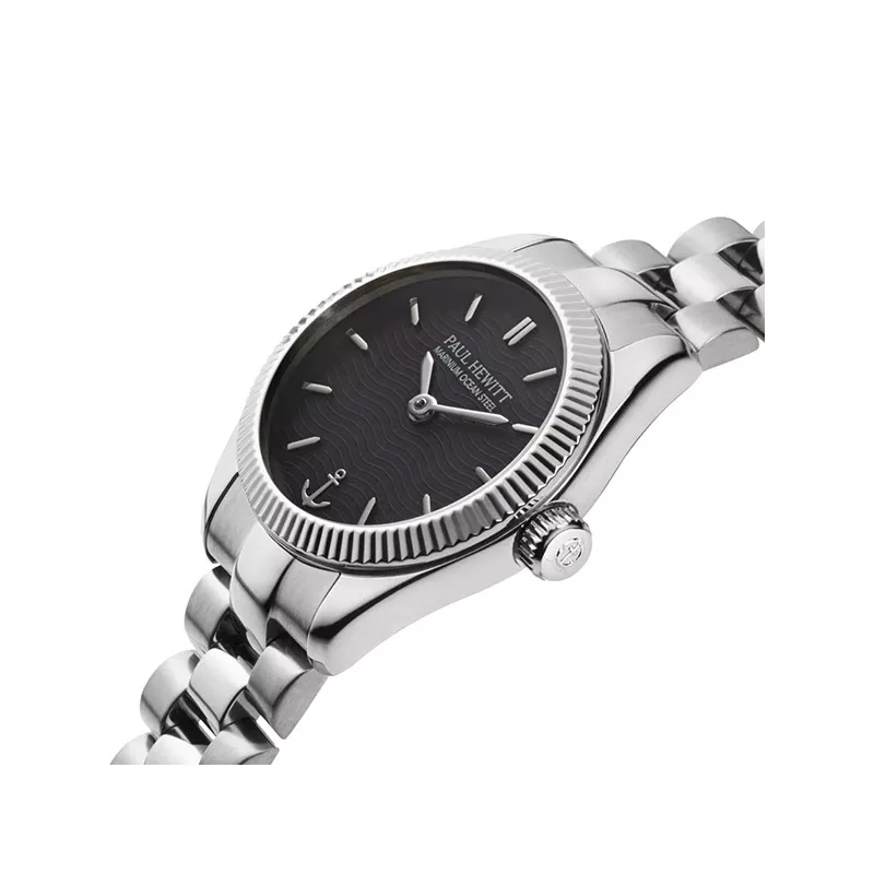 Luxus Design mit der Kraft des Lichtes angebrieben. Herzstück dieser Paul Hewitt Damenuhr ist das kleinste Solaruhrwerk der Welt von EPSON. Das Wellendesign des Zifferblatts erinnert an die unbeschwerte Leichtigkeit der französischen Riviera und versetzt die Trägerin direkt an den Ozean.