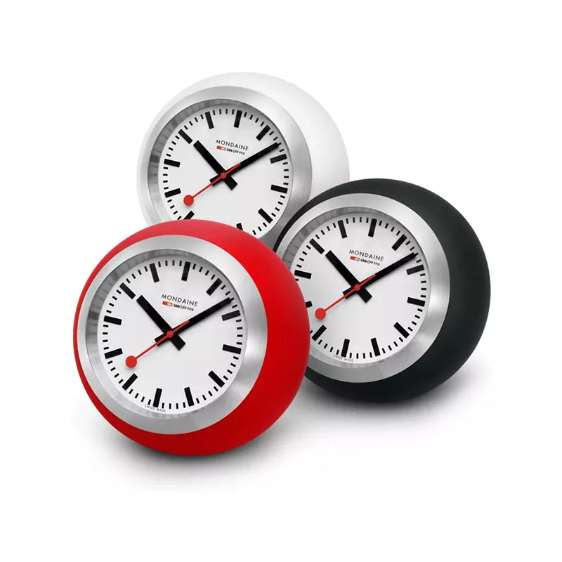 L'horloge de table Mondane Globe. Magnifique accessoire de temps avec un potentiel pour la montre culte. La douille en silicone rouge autour du cadran de la gare avec le verre minéral bombé, reprend la forme de la boule...