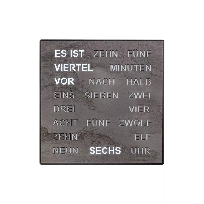 28x28cm - Avec cette "horloge des mots", l'heure ne s'affiche pas en chiffres, mais en mots. Les mots sont illuminés sur le cadran LED noir. Très facile à lire dans le noir !