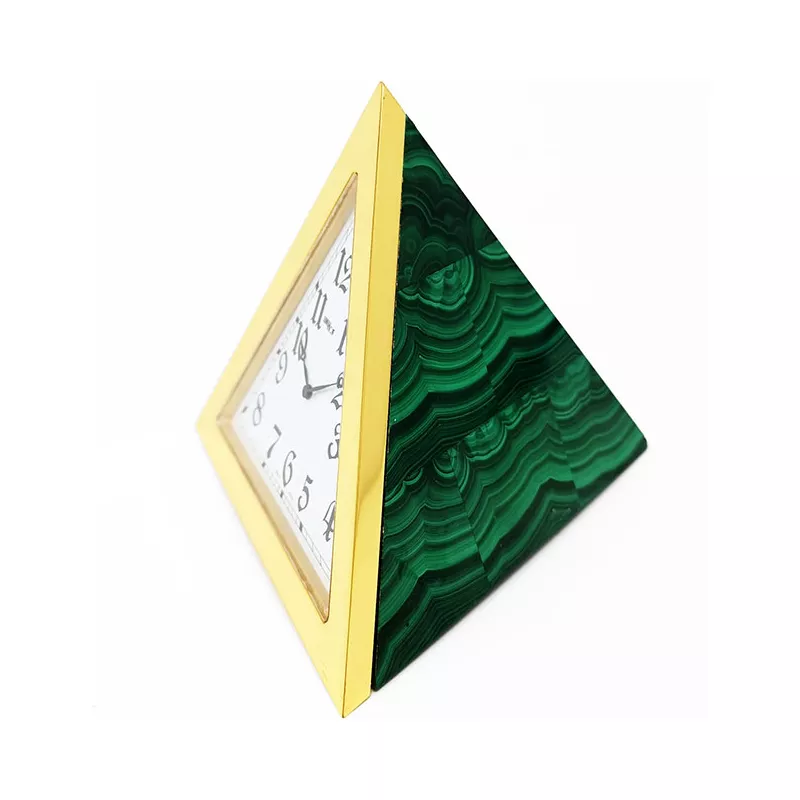 12.5x14cm - Horloge de table premium en forme de pyramide avec véritable pierre semi-précieuse malachite et boîtier en laiton plaqué or de haute qualité. La montre de quartz de précision suisse s’adapte idéalement à un bureau exclusif ou...