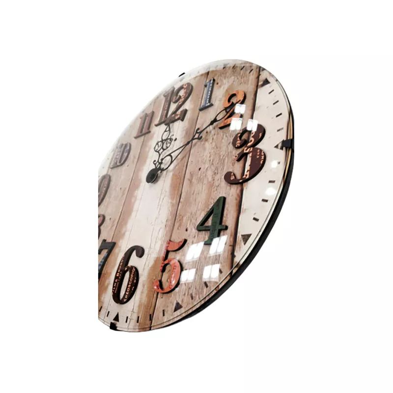 Ø : 30cm - Horloge murale quartz dans le look antique avec chiffres en relief. Horloge murale design effet bois clair au style rétro et rustique avec verre bombé.