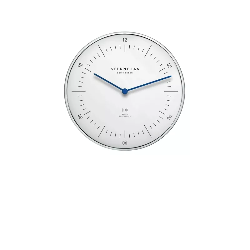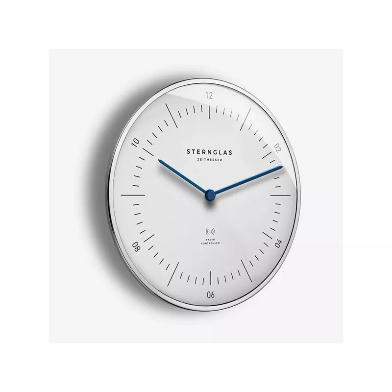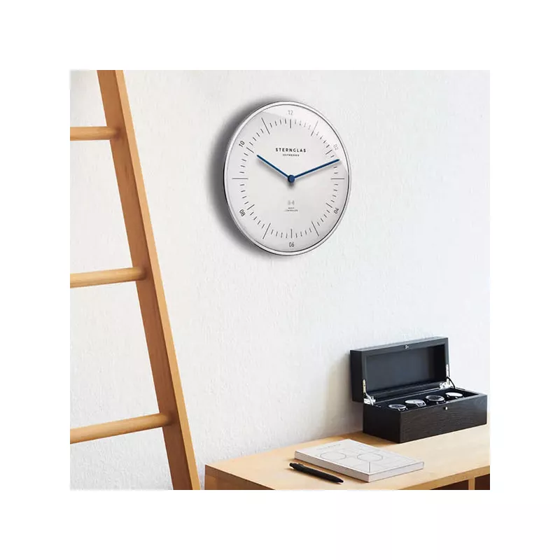 Le design simple du Bauhaus de Hambourg avec le cadran blanc et les aiguilles bleues confèrent à l'horloge murale radio-pilotée une élégance intemporelle. Les horloges de salon de Sternglas sont de haute qualité, faciles à lire et extrêmement précises.