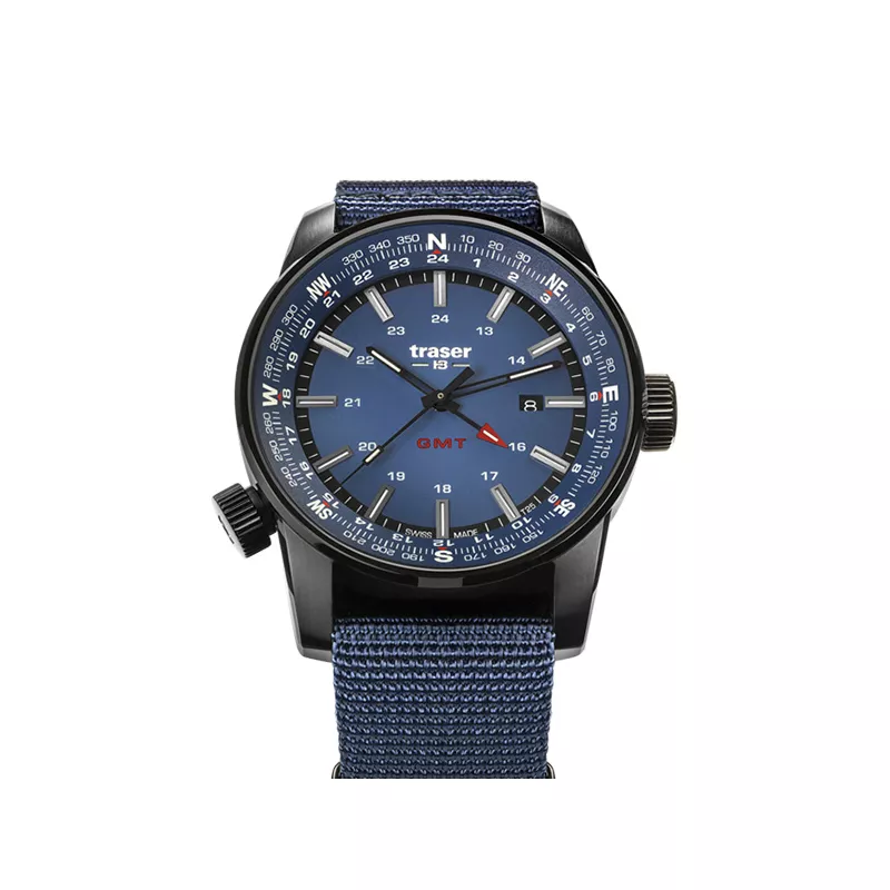 La montre de quartz bleu dualtime TRASER Pathfinder GMT est pour les globe-trotters, les explorateurs et les esthètes. Que ce soit dans la jungle de grande ville, dans les zones désertiques arides ou en déplacement sur toutes les mers.