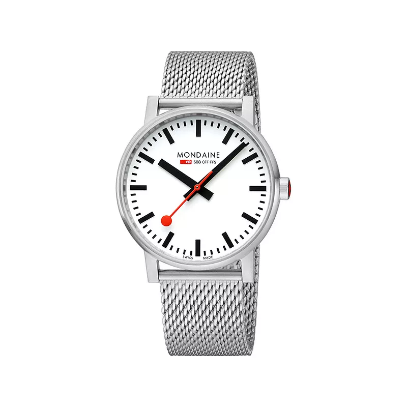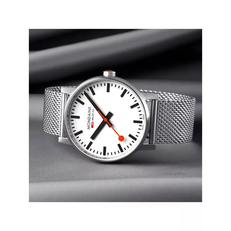 Découvrez toujours les dernières sélections de montres MONDAINE dames et messieurs dans notre magasin spécialisé dans le centre de Bâle. Nous sommes partenaires agréés depuis plus de 25 ans et nous prenons en stock presque tous les modèles disponibles. Pour Montres-En-Ligne.ch, il y a aussi d’autres horloges de gare. Cliquez simplement sur le logo »