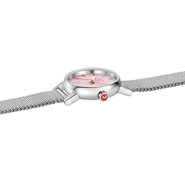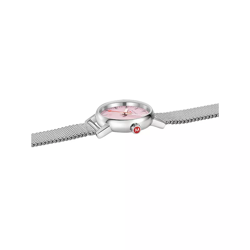 Édition limitée : Mondaine Evo Ø : 26 mm en rose avec verre saphir inrayable et bracelet milanais. Le petit modèle tendance pour femme avec une trotteuse rouge et un boîtier de montre rond et organique reflète le style Wilde Rose.