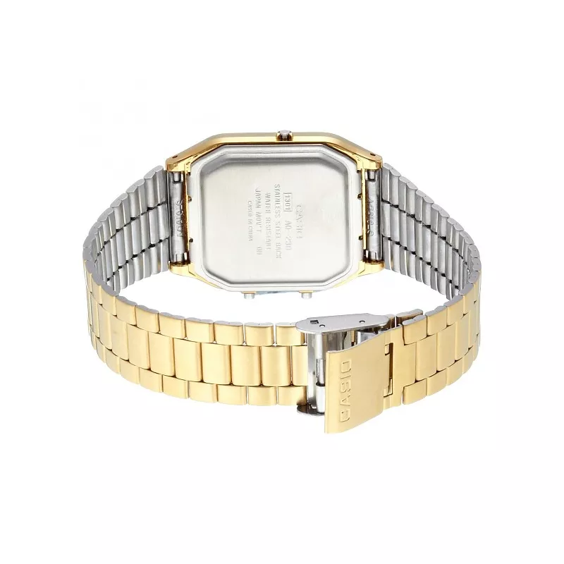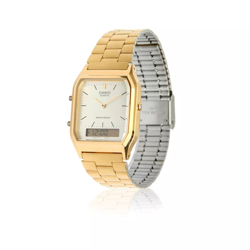 Pratique et bien lisible. Des scoops rétro des années 80. Montre or avec affichage analogique et numérique, deuxième fuseau horaire, alarme, chronomètre et calendrier.