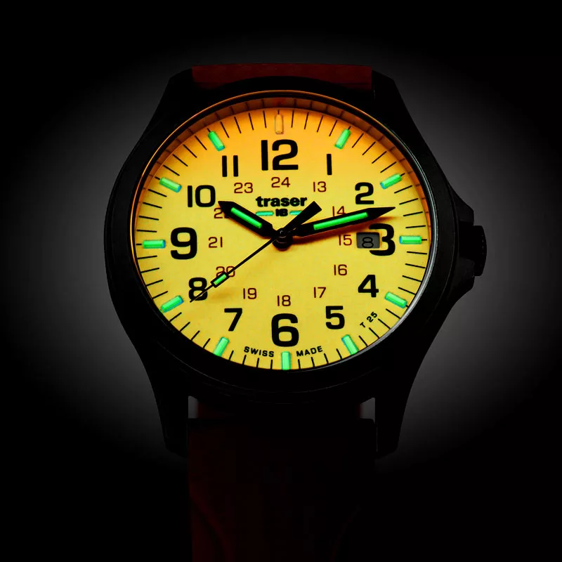 Deux technologies d’éclairage dans une horloge. Le cadran de l’agent Pro GunMetal est entièrement recouvert de Super-LumiNova orange, offrant ainsi l’arrière-plan idéal pour les 17 tubes trigalight auto-éclairés, intégrés dans les aiguilles, les index et sous le logo. Le cadran de cette montre H3 est entouré d’un joint en verre lumineux.