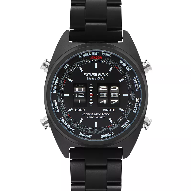Le nom Future Funk fait référence à la conception flippante et futuriste de la marque. Life is a Circle. L’affichage numérique sur les rouleaux imprimés fait de ces accessoires de véritables eye-catchers au poignet.