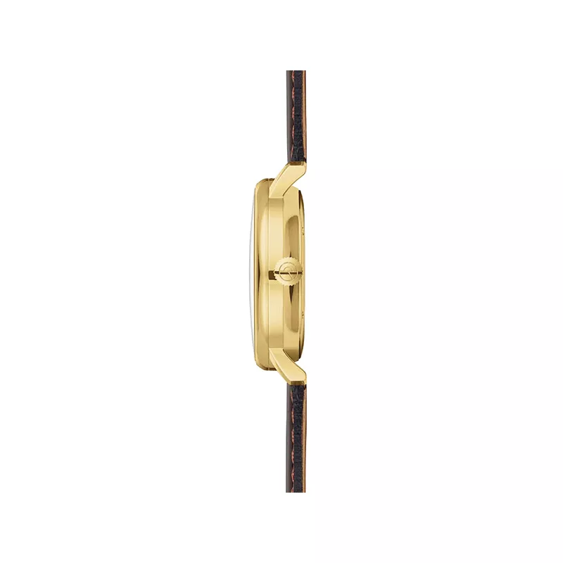 Montre solaire moderne avec cadran vert foncé et élégant boîtier plaqué or. Cette montre-bracelet fine transforme la lumière du soleil ou artificielle en énergie pure.