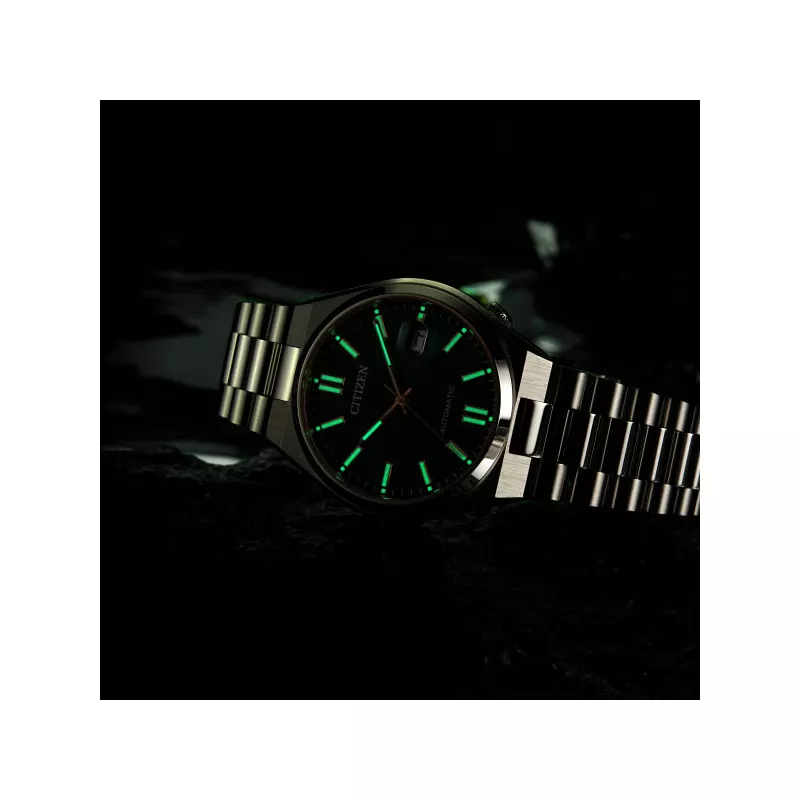 Les montres Citizen impressionnent par leur précision et leur excellent rapport qualité-prix. Par conséquent, les montres automatiques représentent une véritable alternative aux montres du segment de luxe pour de nombreux amateurs de montres.Le boîtier et le bracelet de la montre sont en acier inoxydable de haute qualité. Des éléments brillants mettent en valeur le matériau brossé autrement mat. Le cadran soleillé est protégé par un verre saphir inrayable avec une loupe incrustée au-dessus de la date. Le fond du boîtier est également en verre pour que le mouvement soit visible.