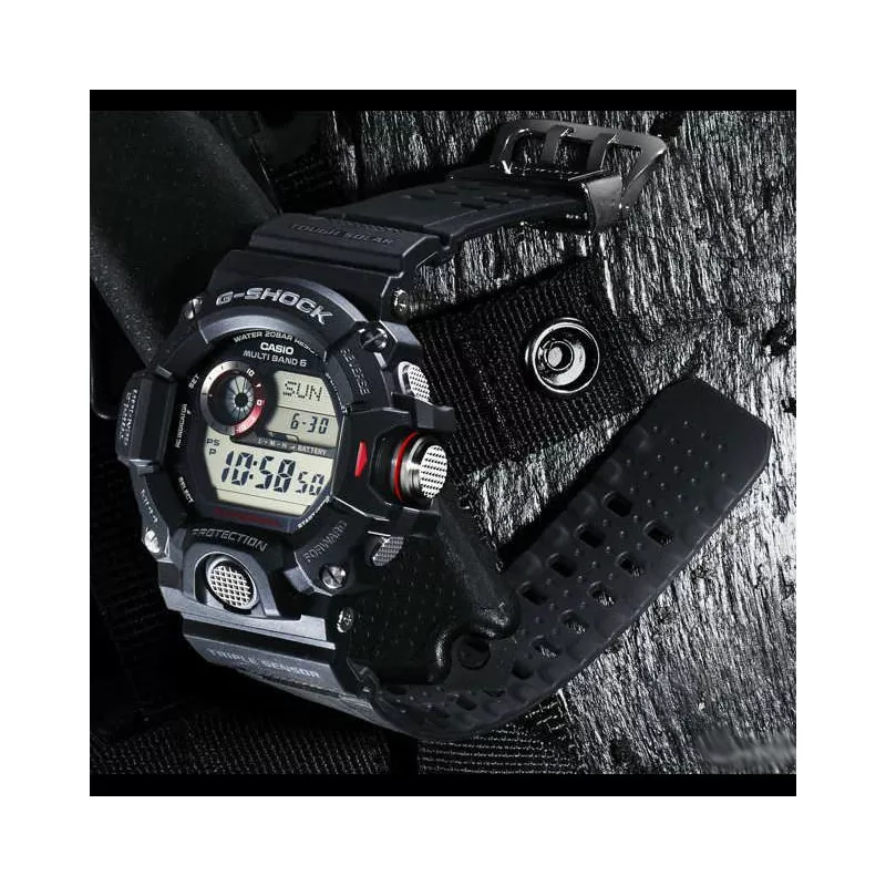 La montre noir de G Rangeman de la collection G-Shock radio-piloté avec utilisation Smart Access simple. Altimètre jusqu’à 1'000m, 5 alarmes, baromètres, boussoles numériques, thermomètres...