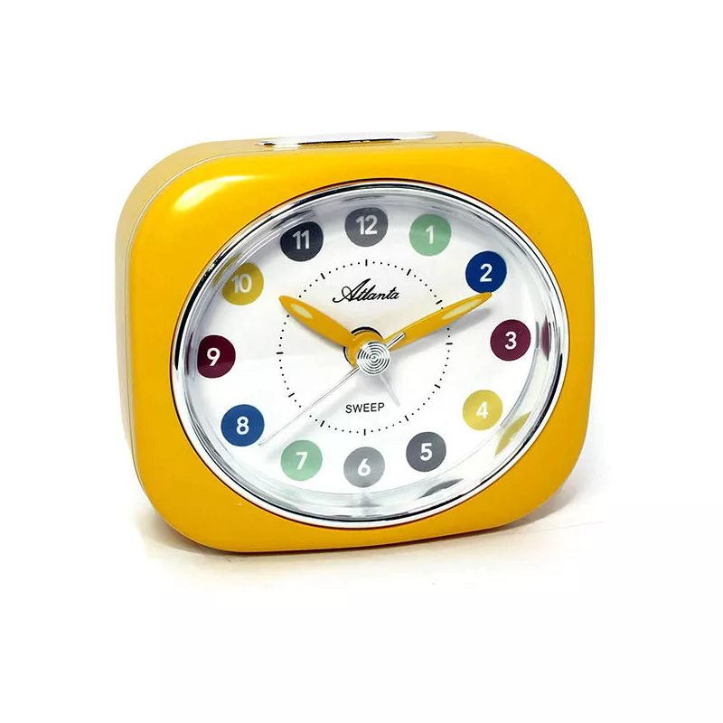Ø : 8 cm - Le petit réveil jaune avec chiffres pour enfants a une trotteuse rampante qui s'entend à peine. La fonction snooze est activée via la butée supérieure et fait retentir à nouveau l'alarme après environ 4 minutes. Lumière LED.